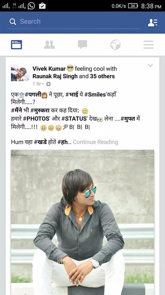 Translation: One mad girl asked, “Bro, where will I get smiles?” I just smiled and replied, “Look at my photos and status, you’ll get smiles for free”. And then he felt “cool” with 36 people. So, now you know where to look up to for free smiles when you’re down or sad.